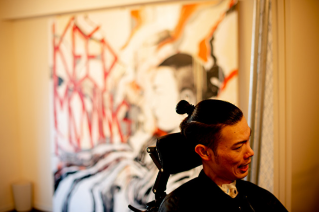 武藤さんはわずかに動く首を振って、配達人に会釈した。手元のレバーを指で操作して車いすを方向転換し、大きな絵が掛けられた部屋の隅に視線をやると、スタッフに指示した。「こっちに、運んでもらうよう、伝えてください」。かすれた声でゆっくりと、一語一語を絞り出す。